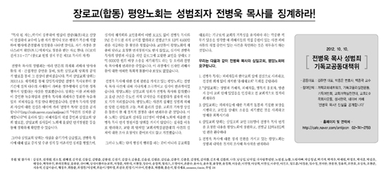 아울러 공대위는 전병욱 목사의 회개를 촉구하고, 평양노회에 성범죄자 전 목사의 징계를 요청하는 의견문을 일간지와 무가지에 10일 의견 광고로 게재하기도 했다.