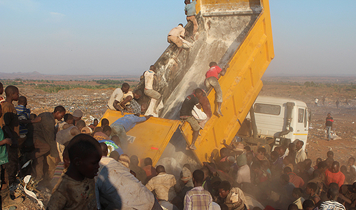 | ▲쓰레기차를 보고 달려드는 지역 주민들 |