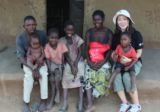 | ▲배우 윤유선씨가 말라위 한 가정집을 방문, 식량 키트를 전달한 뒤 가족들과 기념촬영을 하고 있다. |