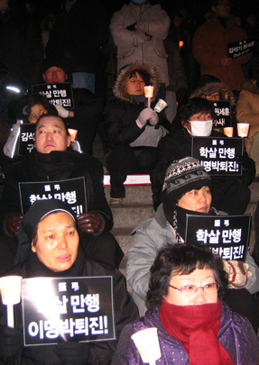 이들은 설 연휴를 맞아 고향으로 내려가는 귀성객들을 향해 “이명박 퇴진”“철거민 구속한 검찰수사본부 해체” 등을 외치며 정부를 규탄했다.