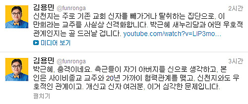 그는 또 "신천지는 이만희라는 교주를 사실상 신격화한다. 박근혜 새누리당과 어떤 우호적 관계인지는 곧 드러날 것”이라며, 박근혜 캠프의 기독대책 공동본부장인 이경재 전 의원이 신천지 관련 행사에 참가한 동영상 링크 주소를 트위터에 함께 올렸다.