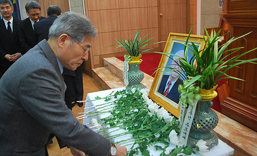 | ▲고 은곡 김소영 목사 1주기 추모예배에서 전국YMCA연맹 안재웅 이사장이 헌화하고 있다. ⓒ베리타스 |