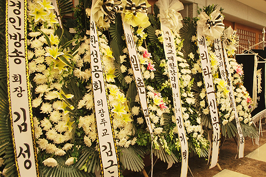 | ▲고 오재식 박사의 영면을 바라며 각계각층에서 보내온 근조화환들. ⓒ베리타스 |
