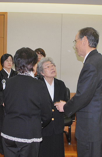 | ▲고 오재식 박사의 부인 노옥신 여사(가운데)가 조문객을 맞이하고 있다. ⓒ베리타스 |