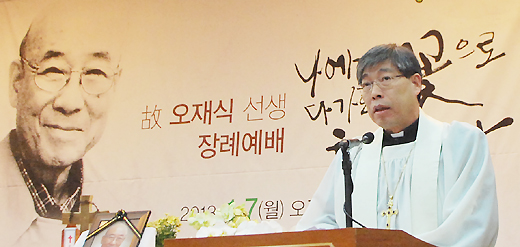 | ▲김근상 NCCK 회장이 고 오재식 선생 장례예배에서 설교하고 있다. ⓒ베리타스 |
