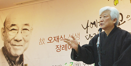 | ▲김영주 NCCK 총무가 고 오재식 선생 장례예배에서 호상 인사를 하고 있다. ⓒ베리타스 |