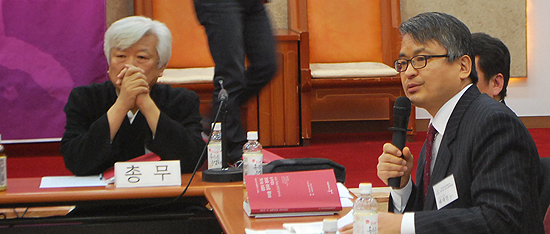 | ▲기타 토의 시간에 김영주 NCCK 총무(좌)가 ‘WCC 공동선언문’과 관련해 실행위원들 앞에 사죄의 뜻을 밝힌 직후 배태진 목사(한국기독교장로회총회 총무, 우)가 발언하고 있다. ⓒ베리타스 |