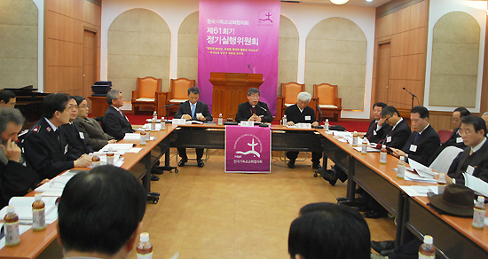 17일 서울 연지동 기독교회관 2층 강당에서 열린 NCCK 제61회기 1차 정기실행위원회에서 참석한 실행위원들은 기타 토의 시간을 이용해 ‘WCC 공동선언문’에 기관 대표 자격으로 서명을 한 김영주 NCCK 총무를 추궁하던 끝에 이 같은 입장을 밝혔다.