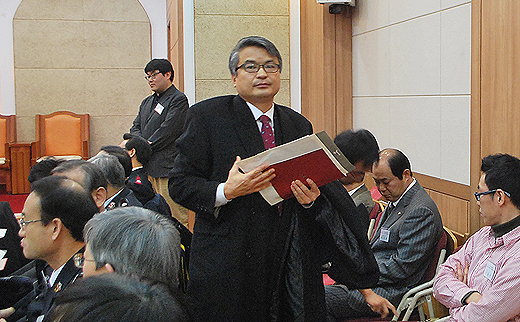 17일 열린 NCCK 제61회기 제1차 정기실행위원회에서 배태진 목사(한국기독교장로회총회 총무)가 퇴장하고 있다. 배 목사는 이날 기타 토의 순서에서 ‘WCC 공동선언문’에 대해 반대 입장을 분명히 하는 한편, 김영주 NCCK 총무를 비롯해 이 일을 주도한 WCC 한국준비위원회 김삼환 상임위원장, 조성기 사무총장의 리더십에 강한 불신을 드러내고는 "모든 위원직을 내려놓겠다"며 자리를 떴다.