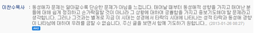 분당우리교회 이찬수 목사가 동성애 문제에 대한 입장을 밝혀 주목을 모으고 있다. 이 목사는 지난 26일 교회 홈페이지에 올라온 한 교수의 글에 댓글을 달았다. 당초 글을 게재한 이 교수는 극심한 호모포비아(동성애혐오증) 증상을 보이고 있었다.