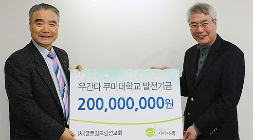 | ▲우간다에 소재한 쿠미대학교 총장직을 수락한 황성주 박사(우)가 정정섭 기아대책 회장에게 대학발전 기금 2억원을 전달하고 있다. ⓒ기아대책 제공 |