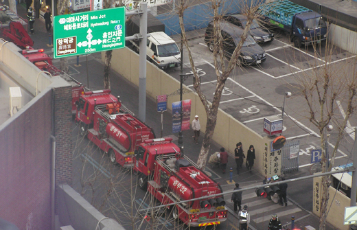 | ▲ 소방차량이 화재 현장 가까이 진입하지 못한 채 대기 중이다 ⓒ베리타스 |