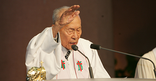 | ▲올해 한국교회 부활절 연합예배 설교자로 선정된 한국교회 최고령 목회자 방지일 목사(영등포교회 원로)가 작년 부활절 연합예배에서 축도하고 있는 모습. ⓒ베리타스 DB |
