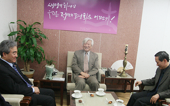| ▲유진룡 문화체육관광부 장관이 12일 오후 김영주 NCCK 총무를 방문했다. 총무실에서 환담을 누고 있는 유 장관(좌)과 김 총무(가운데). ⓒ베리타스 |