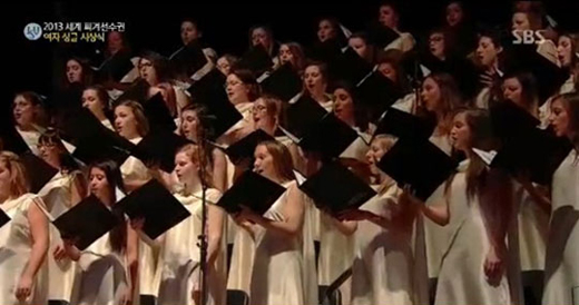 | ▲2013년 국제빙상경기연맹 세계선수권대회 시상식에서 캐나다 소녀 합창단이 애국가를 부르고 있다. ⓒSBS |