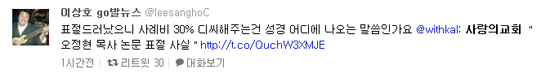또 트위터 아이디 @AngelinoKim는 "목사가 논문표절에 고작 6개월? 사직도 아니고"라고 했으며, @soobynam 역시 "박사학위가 표절이면 사임해야 한다. 적당히 넘어가면 안된다"고 맞장구를 쳤다.