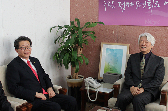 류길재 통일부 장관이 28일 오전 김영주 한국기독교교회협의회(이하 NCCK) 총무를 예방했다. 류 장관은 이날 김 총무와 만난 자리에서 남북관계 및 한반도 평화와 관련해 대화를 나눴다.(사진=NCCK 제공)