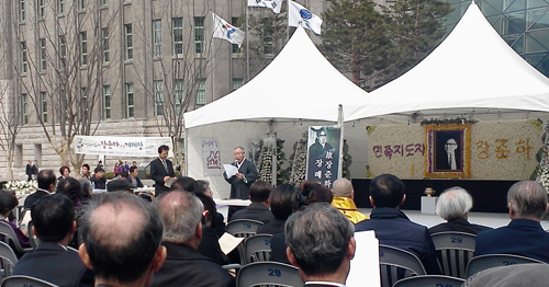 故 장준하 선생의 겨레장이 28일 오전 서울 시청광장에서 엄수됐다. NCCK 정의평화위원회(위원장 허원배 목사) 주최로 열린 이날 장례예식에서 설교를 전한 허원배 목사는 "조국은 장준하 선생의 생명을 빼앗았다"며 "진실규명 노력은 거대한 벽에 부딪혔다. 그러나 진실과 정의의 하나님 그리고 지금도 살아계신 하나님을 우리는 다시 보게 된다"고 말했다.