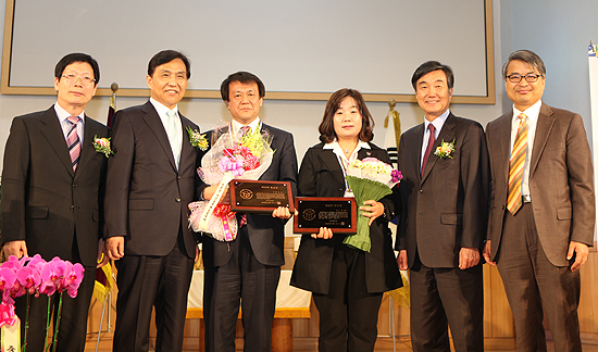 | ▲12일 오전 11시 오산캠퍼스 교회당에서 한신대학교 개교 73주년 기념예식이 진행됐다. 이날 기념예식에서는 제20회 한신상 시상식도 더불어 열렸다. 한신상 공동 수상자 김해성 목사(왼쪽에서 세번째)와 윤미향 상임대표(왼쪽에서 네번째)가 상패를 들어 보이고 있다. |