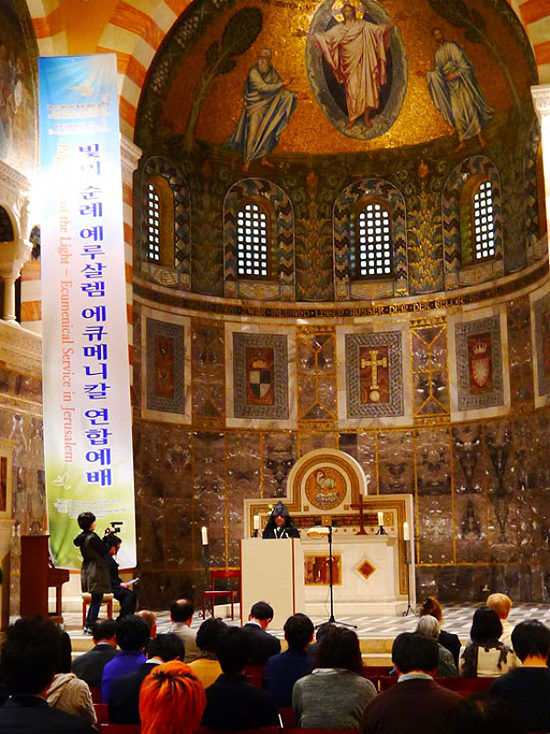 | ▲지난 10일(현지시간) 예루살렘 감람산 아우구스투스 빅토리아 승천교회에서 열린 에큐메니칼 예배가 열렸다. 설교자로 나선 김삼환 상임위원장은 ‘빛의 순례’ 사업의 의의에 대해 설명하기도 했다. |