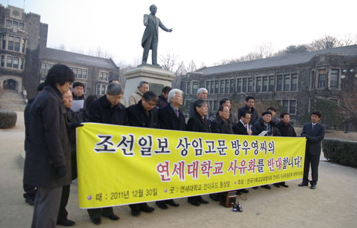 | ▲지난 2011년 12월 연세대 사유화 저지를 위해 언더우드 동상 앞에 모인 교계 지도자들. ⓒ베리타스 DB |