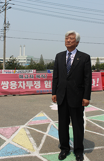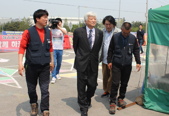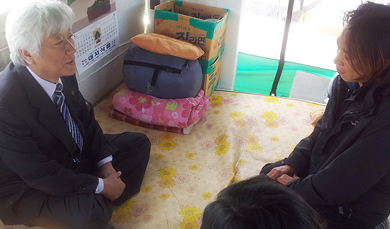 | ▲김영주 NCCK 총무(가운데)가 쌍용자동차 노조측 지부장을 면담한 뒤 송전탑에서 농성 중인 해고 노동자를 위로 방문하기 위해 발걸음을 옮기고 있다. |