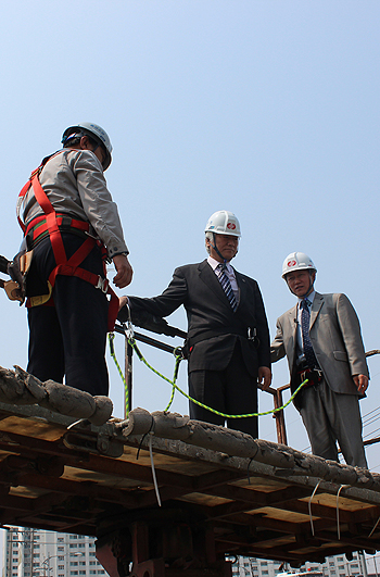 | ▲김영주 NCCK 총무(가운데)와 이훈삼 NCCK 정의평화위원회 국장(우)이 사다리차를 타고 쌍용차 해고 노동자들이 농성을 벌이는 송전탑으로 올라가고 있다. |