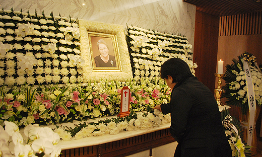 | ▲고 박영숙 권사의 지인이 빈소를 조문해 헌화하고 있다. ⓒ베리타스 |