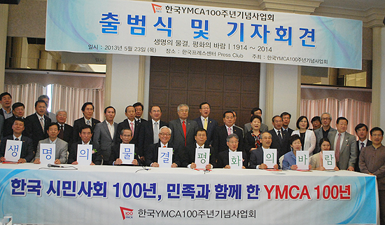 한국 YMCA가 23일 오전 서울 프레스센터에서 ‘100주년 기념사업회’ 출범식 및 기자회견을 가졌다. 이날 출범식에서 서광선 박사(세계YMCA연맹 전 회장, 기념사업회 공동대표)가 여는 기도를, 안재웅 박사(한국YMCA전국연맹 이사장, 기념사업회 공동대표)가 환영사를 전했다. 또 조헌재 차관(문화체육관광부), 김영주 총무(한국기독교교회협의회)는 축사를, 남부원 사무총장(한국YMCA전국연맹)은 100주년 기념사업 계획을 알렸으며, 정현백 공동대표(한국시민사회단체연대회의), 차경애 회장(한국YWCA연합회)이 100주년 기념사업에 바라는 바를 전했다.