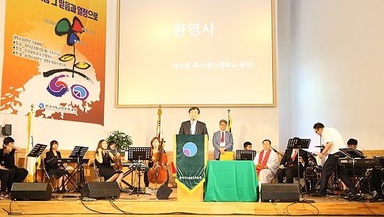 | ▲한국기독교장로회 총회의 새역사 60주년 기념예배가 10일 오후 2시 경기도 오산 한신대학교에서 열렸다. 채수일 한신대 총장이 환영사를 전하고 있다. ⓒ한신대 제공 |