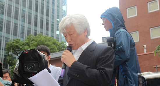 | ▲김영주 교회협 총무가 12일 일본 대사관 앞에서 인사말을 전하고 있다. |