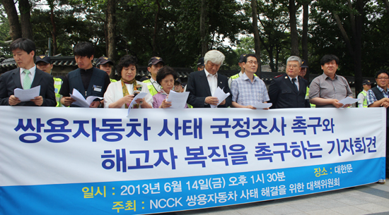 한국기독교교회협의회(이하 NCCK, 총무 김영주 목사)는 14일 서울 덕수궁 대한문 앞에서 기자회견을 열고, 쌍용자동차 국정조사 실시와 해고자 복직을 촉구했다. NCCK는 먼저 쌍용차 사태로 고용주와 피고용주 사이의 갈등의 골이 깊어지고 있음을 지적하며, "사회적 약자를 돌보지 않고 공권력을 이용해 그들을 억압하는 정부의 무책임한 태도는 사회를 양분시키고 있다"고 전했다.