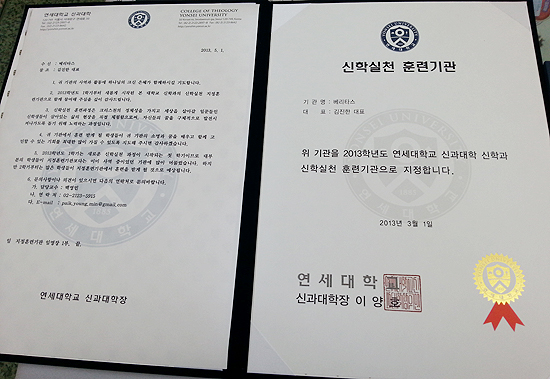 연세대 신과대학(학장 이양호)이 본지에 산학협력 관련 임명장을 전달했다. 연세대 신과대학은 본지를 2013년 신학실천 훈련기관으로 지정했다. 이에 따라 본 기관에 지원한 신학생들은 학기 중 객원기자로 신학실천 훈련을 받게 되었다.