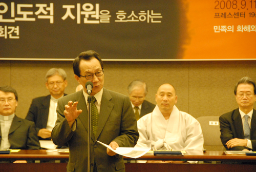 세계결핵제로운동본부 이윤구 총재는 북한 실정과 관련, “올해 연말까지 100만톤 내지 150만톤의 쌀이 지원되지 않는다면 100만명 이상의 아사자가 발생할 것”이라고 밝혔다. 이어 박종화 목사(경동교회 당회장, 한국국제보건의료재단 총재) 역시 “북한엔 지금 ‘기근’의 쓰나미가 몰려오고 있다”면서 “정치, 이념을 떠나서 죽어가는 동포들을 살리고 봐야 한다”고 주장했다.