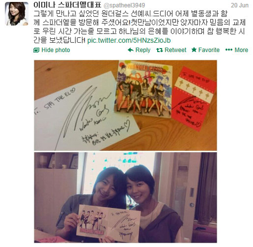 이미나는 “그렇게 만나고 싶었던 원더걸스 선예 씨. 첫 만남이었지만 우린 시간 가는 줄 모르고 하나님의 은혜를 이야기하며 참 행복한 시간을 보냈답니다”라는 글과 함께 선예와 함께 찍은 사진을 공개했다.