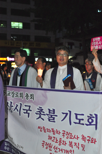 쌍용차 해고자 복직과 국정원 진실규명을 위해 기장인들이 한 자리에 모였다. 지난 18일 오후 7시 40분 서울시청 앞 대한문 앞에서 한국기독교장로회(이하 기장) 비상시국 촛불기도회가 열렸다. 기도회에는 기장 총회 안팎의 성도와 일반 시민 약 200여명이 참석했다. 기도회 순서를 마친 참석자들 이후 대한문 앞에서 청계광장까지 평화행진을 벌였다.(사진= 기장 총회 제공)