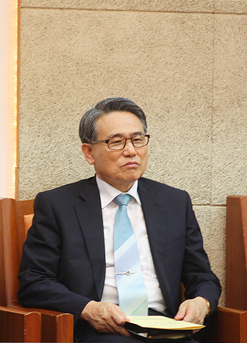 한국기독교사회봉사회(이하 한기봉)가 23일 오후 서울 연지동 기독교회관 2층 강당에서 ‘창립 50주년 기념예배 및 심포지움’을 열었다. 예배순서를 맡은 정의선 이사장이 자신의 순서를 기다리고 있다. 이날 정의선 이사장은 초청사와 함께 50년간의 사역을 설명했다.