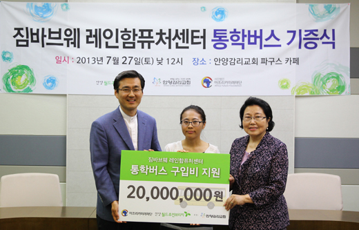 안양월드휴먼브리지(대표 임용택)는 27일 아프리카 미래재단(대표 황영희)에 짐바브웨 레인함퓨처센터 통학버스 구입 지원금 2천만원을 전달했다.