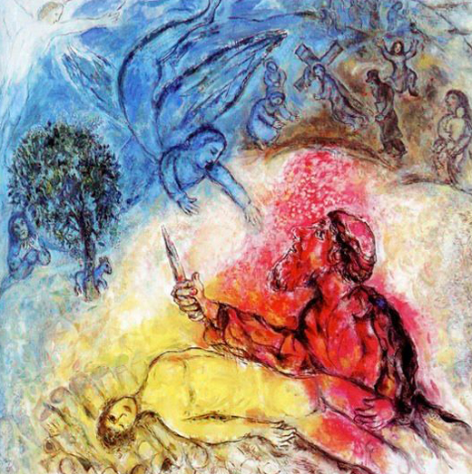 샤갈의 이 주제에 대한 또 다른 그림이다. 샤갈은 이 그림의 제목을 “아브라함의 제사”가 아니라 “이삭의 희생”이라고 이름 붙였다.