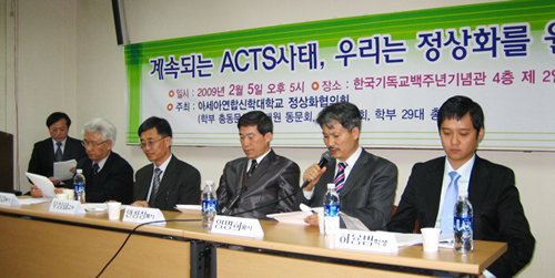 대책을 강구하지도 해법도 없는 학내 사태 해결을 촉구하기 위해 아신대정상화협의회는 5일 오후 5시 서울 연지동 한국교회백주년기념관에서 기자회견을 열었다. 교수협의회, 총동문회, 총학생회, 기독교계 신문 기자 등 60여 명이 참석했다.