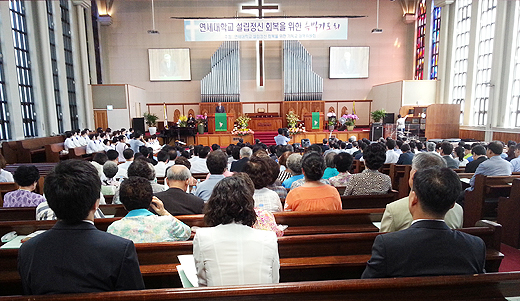 | ▲서울 신촌 소재 창천교회에서 ‘연세대 설립정신 회복을 위한 특별기도회’가 열렸다. ⓒ베리타스 |