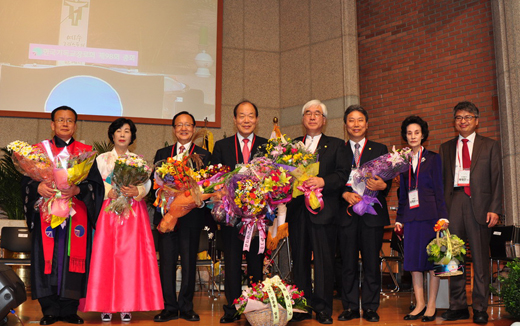 | ▲기장 제98회 총회 신임원진이 꽃다발을 안고 기념촬영에 임하고 있다. ⓒ베리타스 DB |