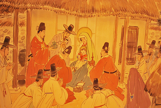 | ▲한복을 곱게 차려 입은 안기 예수의 탄생을 축하하기 위해 무관을 쓴 동방박사들이 아기 예수를 둘러싸고 있다. ⓒ베리타스 |