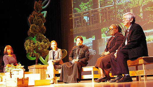 | ▲6일 오전 부산 벡스코 오디토리움에서 ‘정의’를 주제로 한 전체회의가 열렸다. 환영 및 소개 순서에 이어 마당 토크쇼가 열리고 있다. ⓒ베리타스 |