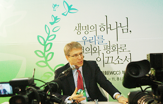 | ▲울라프 픽쉐 트베이트 WCC 총무가 7일 오후 WCC 제10차 부산총회를 마무리하는 기자회견을 갖고 있다. ⓒ부산=김진한 기자 |