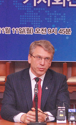 | ▲WCC 울라프 트베이트 총무가 11일 오전 기독교회관 2층 조에홀에서 기자회견을 갖고 있다. ⓒ베리타스 |