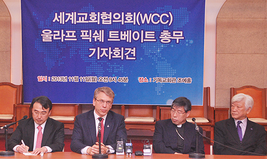 | ▲11일 울라프 픽쉐 트베이트 총무 기자회견에 동석한 김근상 NCCK 회장(우측 두번째)과 김영주 NCCK 총무(우측 첫번째). ⓒ베리타스 |