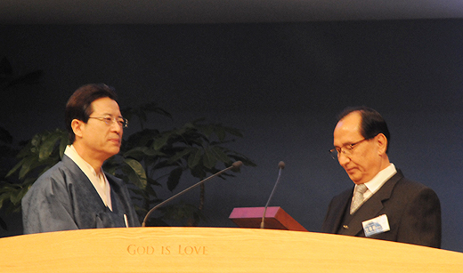 | ▲예장합동 안명환 총회장(우)이 설교를 마친 뒤 사랑의교회 오정현 담임목사(좌)에게 감사패를 전달하고 있다. ⓒ사진=김진한 기자 |