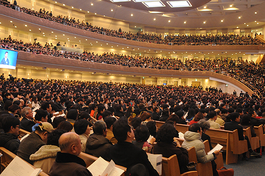 | ▲새 예배당 본당을 가득 메운 사랑의교회 교인들. ⓒ사진=김진한 기자 |