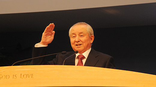 | ▲1부 예배 축도를 앞두고, 사랑의교회 교인들에 조언을 하고 있는 김장환 극동방송 이사장. ⓒ사진=김진한 기자 |